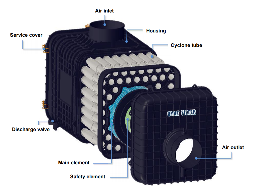 1. Двухступенчатая структура воздушной фильтрации. Оборудована циклонными трубками внутри, что значительно повышает эффективность предварительной фильтрации. 2. По сравнению с другими моделями воздухоочистителей, срок службы фильтрующего элемента увеличен до 2–3 раз. 3. Фильтрующий элемент с надежной устойчивостью складок предотвращает их слипание в жестких условиях. 4. Корпус изготовлен из ударопрочного полипропилена, который легкий, термостойкий и не подвержен коррозии.